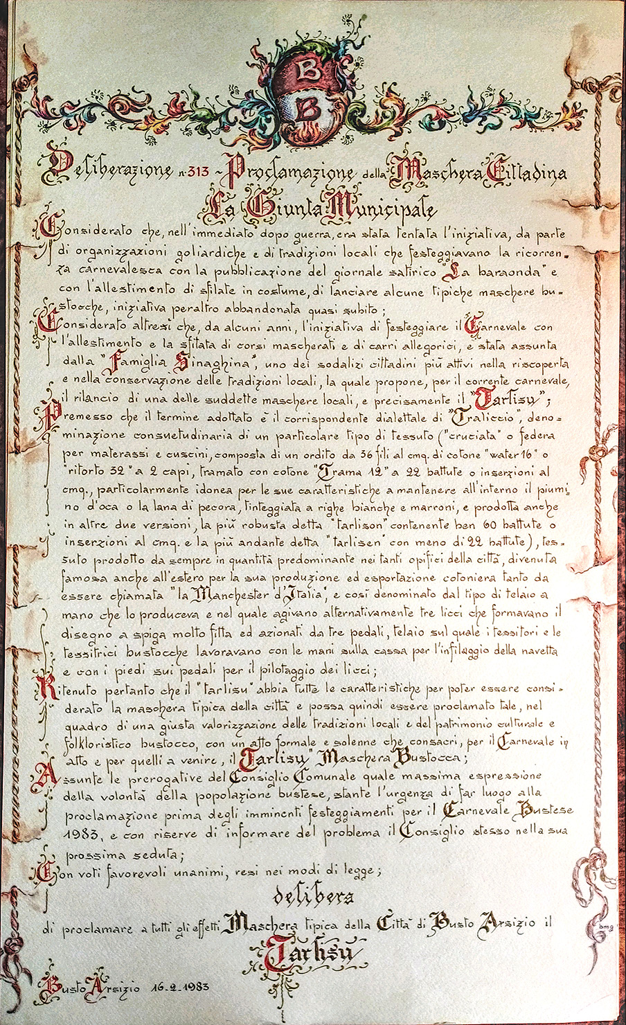 La proposta fu accolta con entusiasmo dal Sindaco Angelo Borri e con delibera n. 313 del 16.2.1983 la Giunta Municipale deliberò di proclamare a tutti gli effetti il TARLlSU MASCHERA TIPICA della città di Busto Arsizio.
